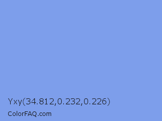 Yxy 34.812,0.232,0.226 Color is a light blue color and the nearest color is Portage #8b9fee. Hex code #7d9eeb and RGB value is rgb(125,158,235). In RGB color space, this color is composed of 49% red, 62% green, 92% blue, In CMYK color space, this color is composed of 47% cyan, 33% magenta, 0% yellow , 8% black , In HSL color space, this color has a hue angle of 222° , 73% saturation and 71% lightness.