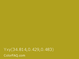Yxy 34.814,0.429,0.483 Color is a normal yellow color and the nearest color is Lucky #af9f1c. Hex code #b0a11e and RGB value is rgb(176,161,30). In RGB color space, this color is composed of 69% red, 63% green, 12% blue, In CMYK color space, this color is composed of 0% cyan, 9% magenta, 83% yellow , 31% black , In HSL color space, this color has a hue angle of 54° , 71% saturation and 40% lightness.