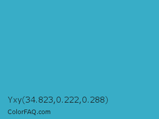 Yxy 34.823,0.222,0.288 Color is a normal cyan color and the nearest color is Pelorous #3eabbf. Hex code #38adc7 and RGB value is rgb(56,173,199). In RGB color space, this color is composed of 22% red, 68% green, 78% blue, In CMYK color space, this color is composed of 72% cyan, 13% magenta, 0% yellow , 22% black , In HSL color space, this color has a hue angle of 191° , 56% saturation and 50% lightness.
