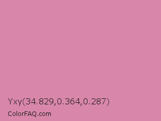 Yxy 34.829,0.364,0.287 Color is a light rose color and the nearest color is Can Can #d591a4. Hex code #d887aa and RGB value is rgb(216,135,170). In RGB color space, this color is composed of 85% red, 53% green, 67% blue, In CMYK color space, this color is composed of 0% cyan, 38% magenta, 21% yellow , 15% black , In HSL color space, this color has a hue angle of 334° , 51% saturation and 69% lightness.