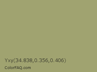 Yxy 34.838,0.356,0.406 Color is a normal yellow color and the nearest color is Green Smoke #a4af6e. Hex code #a0a370 and RGB value is rgb(160,163,112). In RGB color space, this color is composed of 63% red, 64% green, 44% blue, In CMYK color space, this color is composed of 2% cyan, 0% magenta, 31% yellow , 36% black , In HSL color space, this color has a hue angle of 64° , 22% saturation and 54% lightness.