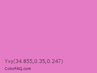 Yxy 34.855,0.35,0.247 Color is a light magenta color and the nearest color is Persian Pink #f77fbe. Hex code #e57bc5 and RGB value is rgb(229,123,197). In RGB color space, this color is composed of 90% red, 48% green, 77% blue, In CMYK color space, this color is composed of 0% cyan, 46% magenta, 14% yellow , 10% black , In HSL color space, this color has a hue angle of 318° , 67% saturation and 69% lightness.