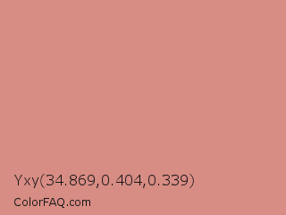 Yxy 34.869,0.404,0.339 Color is a light red color and the nearest color is My Pink #d69188. Hex code #d78c84 and RGB value is rgb(215,140,132). In RGB color space, this color is composed of 84% red, 55% green, 52% blue, In CMYK color space, this color is composed of 0% cyan, 35% magenta, 39% yellow , 16% black , In HSL color space, this color has a hue angle of 6° , 51% saturation and 68% lightness.