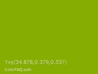 Yxy 34.878,0.379,0.537 Color is a normal lime color and the nearest color is Apple Green #8db600. Hex code #85ad01 and RGB value is rgb(133,173,1). In RGB color space, this color is composed of 52% red, 68% green, 0% blue, In CMYK color space, this color is composed of 23% cyan, 0% magenta, 99% yellow , 32% black , In HSL color space, this color has a hue angle of 74° , 99% saturation and 34% lightness.