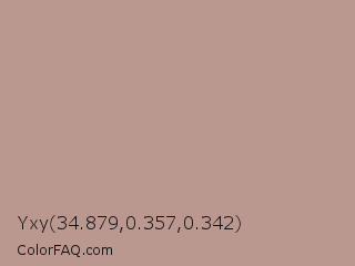Yxy 34.879,0.357,0.342 Color is a light red color and the nearest color is Quicksand #bd978e. Hex code #ba988f and RGB value is rgb(186,152,143). In RGB color space, this color is composed of 73% red, 60% green, 56% blue, In CMYK color space, this color is composed of 0% cyan, 18% magenta, 23% yellow , 27% black , In HSL color space, this color has a hue angle of 13° , 24% saturation and 65% lightness.