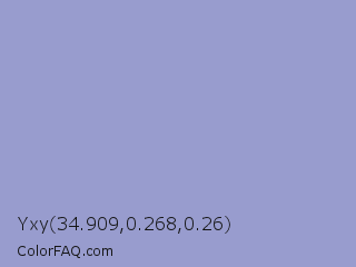 Yxy 34.909,0.268,0.26 Color is a light blue color and the nearest color is Blue Bell Crayola #9999cc. Hex code #989cce and RGB value is rgb(152,156,206). In RGB color space, this color is composed of 60% red, 61% green, 81% blue, In CMYK color space, this color is composed of 26% cyan, 24% magenta, 0% yellow , 19% black , In HSL color space, this color has a hue angle of 236° , 36% saturation and 70% lightness.