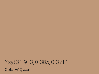 Yxy 34.913,0.385,0.371 Color is a light orange color and the nearest color is Pale Taupe #bc987e. Hex code #bf9879 and RGB value is rgb(191,152,121). In RGB color space, this color is composed of 75% red, 60% green, 47% blue, In CMYK color space, this color is composed of 0% cyan, 20% magenta, 37% yellow , 25% black , In HSL color space, this color has a hue angle of 27° , 35% saturation and 61% lightness.