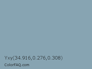 Yxy 34.916,0.276,0.308 Color is a light blue color and the nearest color is Bali Hai #859faf. Hex code #87a4b2 and RGB value is rgb(135,164,178). In RGB color space, this color is composed of 53% red, 64% green, 70% blue, In CMYK color space, this color is composed of 24% cyan, 8% magenta, 0% yellow , 30% black , In HSL color space, this color has a hue angle of 200° , 22% saturation and 61% lightness.