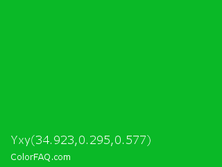 Yxy 34.923,0.295,0.577 Color is a normal green color and the nearest color is Dark Pastel Green #03c03c. Hex code #0ab927 and RGB value is rgb(10,185,39). In RGB color space, this color is composed of 4% red, 73% green, 15% blue, In CMYK color space, this color is composed of 95% cyan, 0% magenta, 79% yellow , 27% black , In HSL color space, this color has a hue angle of 130° , 90% saturation and 38% lightness.