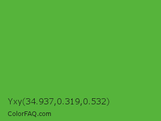 Yxy 34.937,0.319,0.532 Color is a normal green color and the nearest color is Apple #4fa83d. Hex code #56b43b and RGB value is rgb(86,180,59). In RGB color space, this color is composed of 34% red, 71% green, 23% blue, In CMYK color space, this color is composed of 52% cyan, 0% magenta, 67% yellow , 29% black , In HSL color space, this color has a hue angle of 107° , 51% saturation and 47% lightness.