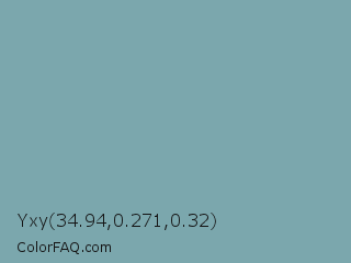 Yxy 34.94,0.271,0.32 Color is a normal cyan color and the nearest color is Gumbo #7ca1a6. Hex code #7ba7ad and RGB value is rgb(123,167,173). In RGB color space, this color is composed of 48% red, 65% green, 68% blue, In CMYK color space, this color is composed of 29% cyan, 3% magenta, 0% yellow , 32% black , In HSL color space, this color has a hue angle of 187° , 23% saturation and 58% lightness.