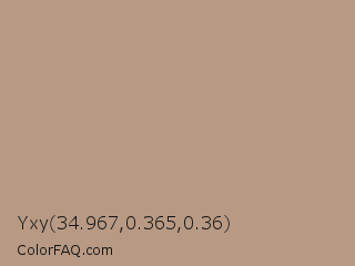 Yxy 34.967,0.365,0.36 Color is a light orange color and the nearest color is Pale Taupe #bc987e. Hex code #b89a84 and RGB value is rgb(184,154,132). In RGB color space, this color is composed of 72% red, 60% green, 52% blue, In CMYK color space, this color is composed of 0% cyan, 16% magenta, 28% yellow , 28% black , In HSL color space, this color has a hue angle of 25° , 27% saturation and 62% lightness.