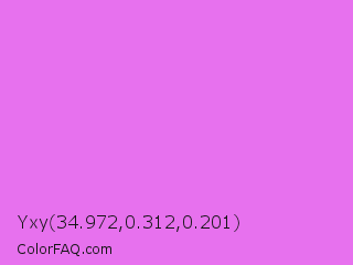 Yxy 34.972,0.312,0.201 Color is a light magenta color and the nearest color is Lavender Magenta #ee82ee. Hex code #e771ee and RGB value is rgb(231,113,238). In RGB color space, this color is composed of 91% red, 44% green, 93% blue, In CMYK color space, this color is composed of 3% cyan, 53% magenta, 0% yellow , 7% black , In HSL color space, this color has a hue angle of 297° , 79% saturation and 69% lightness.