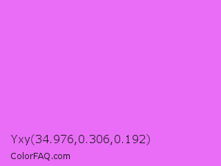 Yxy 34.976,0.306,0.192 Color is a light magenta color and the nearest color is Heliotrope #df73ff. Hex code #e96df7 and RGB value is rgb(233,109,247). In RGB color space, this color is composed of 91% red, 43% green, 97% blue, In CMYK color space, this color is composed of 6% cyan, 56% magenta, 0% yellow , 3% black , In HSL color space, this color has a hue angle of 294° , 90% saturation and 70% lightness.