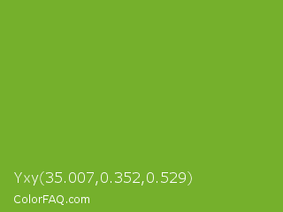 Yxy 35.007,0.352,0.529 Color is a normal green color and the nearest color is Green RYB #66b032. Hex code #75b02c and RGB value is rgb(117,176,44). In RGB color space, this color is composed of 46% red, 69% green, 17% blue, In CMYK color space, this color is composed of 34% cyan, 0% magenta, 75% yellow , 31% black , In HSL color space, this color has a hue angle of 87° , 60% saturation and 43% lightness.