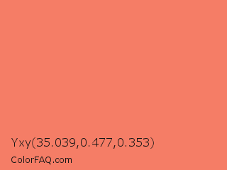 Yxy 35.039,0.477,0.353 Color is a light red color and the nearest color is Coral Reef Hipster Salmon #fd7c6e. Hex code #f57d66 and RGB value is rgb(245,125,102). In RGB color space, this color is composed of 96% red, 49% green, 40% blue, In CMYK color space, this color is composed of 0% cyan, 49% magenta, 58% yellow , 4% black , In HSL color space, this color has a hue angle of 10° , 88% saturation and 68% lightness.
