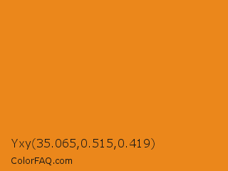 Yxy 35.065,0.515,0.419 Color is a normal orange color and the nearest color is Zest #e5841b. Hex code #eb871b and RGB value is rgb(235,135,27). In RGB color space, this color is composed of 92% red, 53% green, 11% blue, In CMYK color space, this color is composed of 0% cyan, 43% magenta, 89% yellow , 8% black , In HSL color space, this color has a hue angle of 31° , 84% saturation and 51% lightness.