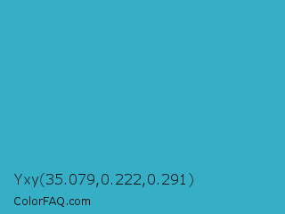 Yxy 35.079,0.222,0.291 Color is a normal cyan color and the nearest color is Pelorous #3eabbf. Hex code #35aec6 and RGB value is rgb(53,174,198). In RGB color space, this color is composed of 21% red, 68% green, 78% blue, In CMYK color space, this color is composed of 73% cyan, 12% magenta, 0% yellow , 22% black , In HSL color space, this color has a hue angle of 190° , 58% saturation and 49% lightness.