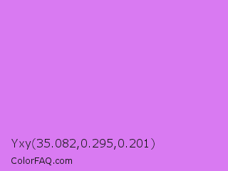 Yxy 35.082,0.295,0.201 Color is a light purple color and the nearest color is Heliotrope #df73ff. Hex code #d97af2 and RGB value is rgb(217,122,242). In RGB color space, this color is composed of 85% red, 48% green, 95% blue, In CMYK color space, this color is composed of 10% cyan, 50% magenta, 0% yellow , 5% black , In HSL color space, this color has a hue angle of 288° , 82% saturation and 71% lightness.