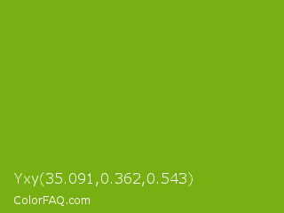 Yxy 35.091,0.362,0.543 Color is a normal green color and the nearest color is Lima #76bd17. Hex code #78b013 and RGB value is rgb(120,176,19). In RGB color space, this color is composed of 47% red, 69% green, 7% blue, In CMYK color space, this color is composed of 32% cyan, 0% magenta, 89% yellow , 31% black , In HSL color space, this color has a hue angle of 81° , 81% saturation and 38% lightness.