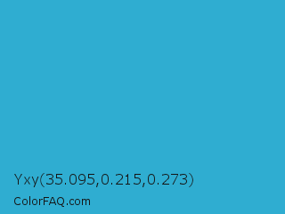 Yxy 35.095,0.215,0.273 Color is a normal cyan color and the nearest color is Ball Blue #21abcd. Hex code #2fadd1 and RGB value is rgb(47,173,209). In RGB color space, this color is composed of 18% red, 68% green, 82% blue, In CMYK color space, this color is composed of 78% cyan, 17% magenta, 0% yellow , 18% black , In HSL color space, this color has a hue angle of 193° , 64% saturation and 50% lightness.