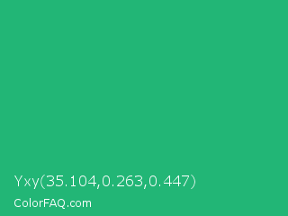 Yxy 35.104,0.263,0.447 Color is a normal green color and the nearest color is Green Crayola #1cac78. Hex code #22b676 and RGB value is rgb(34,182,118). In RGB color space, this color is composed of 13% red, 71% green, 46% blue, In CMYK color space, this color is composed of 81% cyan, 0% magenta, 35% yellow , 29% black , In HSL color space, this color has a hue angle of 154° , 69% saturation and 42% lightness.