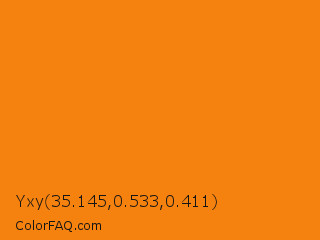 Yxy 35.145,0.533,0.411 Color is a normal orange color and the nearest color is Sorbus #fd7c07. Hex code #f5810e and RGB value is rgb(245,129,14). In RGB color space, this color is composed of 96% red, 51% green, 5% blue, In CMYK color space, this color is composed of 0% cyan, 47% magenta, 94% yellow , 4% black , In HSL color space, this color has a hue angle of 30° , 92% saturation and 51% lightness.