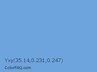 Yxy 35.14,0.231,0.247 Color is a light blue color and the nearest color is Little Boy Blue #6ca0dc. Hex code #6ea4de and RGB value is rgb(110,164,222). In RGB color space, this color is composed of 43% red, 64% green, 87% blue, In CMYK color space, this color is composed of 50% cyan, 26% magenta, 0% yellow , 13% black , In HSL color space, this color has a hue angle of 211° , 63% saturation and 65% lightness.