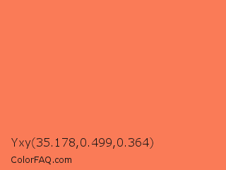 Yxy 35.178,0.499,0.364 Color is a light red color and the nearest color is Coral #ff7f50. Hex code #fa7b57 and RGB value is rgb(250,123,87). In RGB color space, this color is composed of 98% red, 48% green, 34% blue, In CMYK color space, this color is composed of 0% cyan, 51% magenta, 65% yellow , 2% black , In HSL color space, this color has a hue angle of 13° , 94% saturation and 66% lightness.