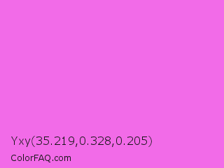Yxy 35.219,0.328,0.205 Color is a light magenta color and the nearest color is Lavender Magenta #ee82ee. Hex code #f26be8 and RGB value is rgb(242,107,232). In RGB color space, this color is composed of 95% red, 42% green, 91% blue, In CMYK color space, this color is composed of 0% cyan, 56% magenta, 4% yellow , 5% black , In HSL color space, this color has a hue angle of 304° , 84% saturation and 68% lightness.