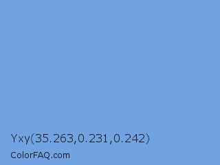 Yxy 35.263,0.231,0.242 Color is a light blue color and the nearest color is Little Boy Blue #6ca0dc. Hex code #71a3e2 and RGB value is rgb(113,163,226). In RGB color space, this color is composed of 44% red, 64% green, 89% blue, In CMYK color space, this color is composed of 50% cyan, 28% magenta, 0% yellow , 11% black , In HSL color space, this color has a hue angle of 213° , 66% saturation and 66% lightness.