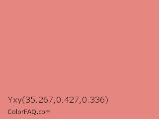 Yxy 35.267,0.427,0.336 Color is a light red color and the nearest color is Light Coral #f08080. Hex code #e58680 and RGB value is rgb(229,134,128). In RGB color space, this color is composed of 90% red, 53% green, 50% blue, In CMYK color space, this color is composed of 0% cyan, 41% magenta, 44% yellow , 10% black , In HSL color space, this color has a hue angle of 4° , 66% saturation and 70% lightness.