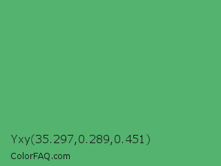 Yxy 35.297,0.289,0.451 Color is a normal green color and the nearest color is Fern #63b76c. Hex code #54b36e and RGB value is rgb(84,179,110). In RGB color space, this color is composed of 33% red, 70% green, 43% blue, In CMYK color space, this color is composed of 53% cyan, 0% magenta, 39% yellow , 30% black , In HSL color space, this color has a hue angle of 136° , 38% saturation and 52% lightness.