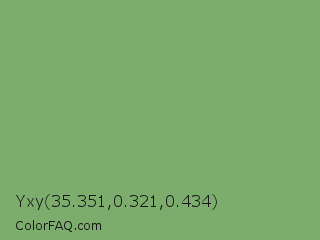 Yxy 35.351,0.321,0.434 Color is a normal green color and the nearest color is Asparagus #87a96b. Hex code #7dad6d and RGB value is rgb(125,173,109). In RGB color space, this color is composed of 49% red, 68% green, 43% blue, In CMYK color space, this color is composed of 28% cyan, 0% magenta, 37% yellow , 32% black , In HSL color space, this color has a hue angle of 105° , 28% saturation and 55% lightness.