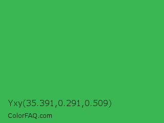 Yxy 35.391,0.291,0.509 Color is a normal green color and the nearest color is Chateau Green #40a860. Hex code #3ab753 and RGB value is rgb(58,183,83). In RGB color space, this color is composed of 23% red, 72% green, 33% blue, In CMYK color space, this color is composed of 68% cyan, 0% magenta, 55% yellow , 28% black , In HSL color space, this color has a hue angle of 132° , 52% saturation and 47% lightness.