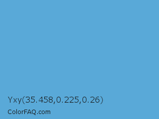 Yxy 35.458,0.225,0.26 Color is a normal blue color and the nearest color is Carolina Blue #56a0d3. Hex code #59a9d8 and RGB value is rgb(89,169,216). In RGB color space, this color is composed of 35% red, 66% green, 85% blue, In CMYK color space, this color is composed of 59% cyan, 22% magenta, 0% yellow , 15% black , In HSL color space, this color has a hue angle of 202° , 62% saturation and 60% lightness.