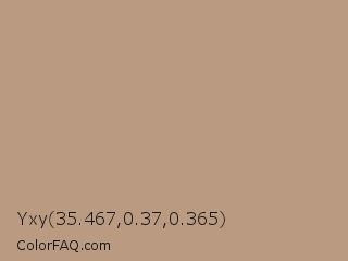 Yxy 35.467,0.37,0.365 Color is a light orange color and the nearest color is Pale Taupe #bc987e. Hex code #ba9b81 and RGB value is rgb(186,155,129). In RGB color space, this color is composed of 73% red, 61% green, 51% blue, In CMYK color space, this color is composed of 0% cyan, 17% magenta, 31% yellow , 27% black , In HSL color space, this color has a hue angle of 27° , 29% saturation and 62% lightness.