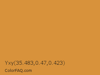 Yxy 35.483,0.47,0.423 Color is a normal orange color and the nearest color is Tigers Eye #e08d3c. Hex code #d8923b and RGB value is rgb(216,146,59). In RGB color space, this color is composed of 85% red, 57% green, 23% blue, In CMYK color space, this color is composed of 0% cyan, 32% magenta, 73% yellow , 15% black , In HSL color space, this color has a hue angle of 33° , 67% saturation and 54% lightness.