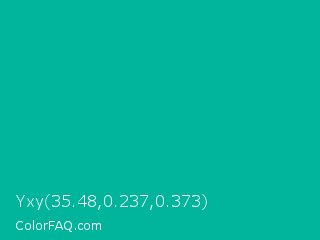 Yxy 35.48,0.237,0.373 Color is a normal cyan color and the nearest color is Persian Green #00a693. Hex code #01b59c and RGB value is rgb(1,181,156). In RGB color space, this color is composed of 0% red, 71% green, 61% blue, In CMYK color space, this color is composed of 99% cyan, 0% magenta, 14% yellow , 29% black , In HSL color space, this color has a hue angle of 172° , 99% saturation and 36% lightness.