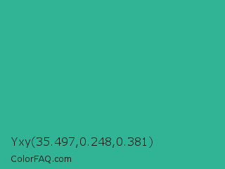 Yxy 35.497,0.248,0.381 Color is a normal cyan color and the nearest color is Mountain Meadow #30ba8f. Hex code #31b496 and RGB value is rgb(49,180,150). In RGB color space, this color is composed of 19% red, 71% green, 59% blue, In CMYK color space, this color is composed of 73% cyan, 0% magenta, 17% yellow , 29% black , In HSL color space, this color has a hue angle of 166° , 57% saturation and 45% lightness.