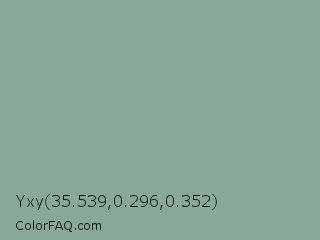 Yxy 35.539,0.296,0.352 Color is a normal green color and the nearest color is Morning Blue #8da399. Hex code #88a899 and RGB value is rgb(136,168,153). In RGB color space, this color is composed of 53% red, 66% green, 60% blue, In CMYK color space, this color is composed of 19% cyan, 0% magenta, 9% yellow , 34% black , In HSL color space, this color has a hue angle of 152° , 16% saturation and 60% lightness.