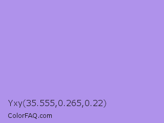 Yxy 35.555,0.265,0.22 Color is a light indigo color and the nearest color is Dull Lavender #a899e6. Hex code #af92eb and RGB value is rgb(175,146,235). In RGB color space, this color is composed of 69% red, 57% green, 92% blue, In CMYK color space, this color is composed of 26% cyan, 38% magenta, 0% yellow , 8% black , In HSL color space, this color has a hue angle of 260° , 69% saturation and 75% lightness.