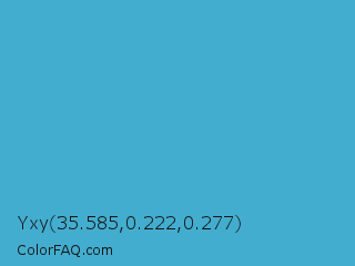 Yxy 35.585,0.222,0.277 Color is a normal blue color and the nearest color is Maximum Blue #47abcc. Hex code #43adcf and RGB value is rgb(67,173,207). In RGB color space, this color is composed of 26% red, 68% green, 81% blue, In CMYK color space, this color is composed of 68% cyan, 16% magenta, 0% yellow , 19% black , In HSL color space, this color has a hue angle of 195° , 59% saturation and 54% lightness.