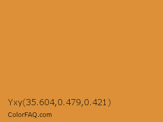 Yxy 35.604,0.479,0.421 Color is a normal orange color and the nearest color is Tigers Eye #e08d3c. Hex code #dd9038 and RGB value is rgb(221,144,56). In RGB color space, this color is composed of 87% red, 56% green, 22% blue, In CMYK color space, this color is composed of 0% cyan, 35% magenta, 75% yellow , 13% black , In HSL color space, this color has a hue angle of 32° , 71% saturation and 54% lightness.