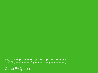 Yxy 35.637,0.315,0.566 Color is a normal green color and the nearest color is Kelly Green #4cbb17. Hex code #44b824 and RGB value is rgb(68,184,36). In RGB color space, this color is composed of 27% red, 72% green, 14% blue, In CMYK color space, this color is composed of 63% cyan, 0% magenta, 80% yellow , 28% black , In HSL color space, this color has a hue angle of 107° , 67% saturation and 43% lightness.