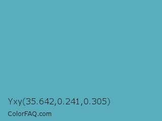Yxy 35.642,0.241,0.305 Color is a normal cyan color and the nearest color is Fountain Blue #56b4be. Hex code #59adbc and RGB value is rgb(89,173,188). In RGB color space, this color is composed of 35% red, 68% green, 74% blue, In CMYK color space, this color is composed of 53% cyan, 8% magenta, 0% yellow , 26% black , In HSL color space, this color has a hue angle of 189° , 42% saturation and 54% lightness.