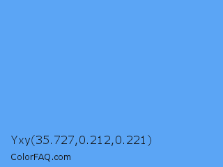 Yxy 35.727,0.212,0.221 Color is a light blue color and the nearest color is Blue Jeans #5dadec. Hex code #5ba5f5 and RGB value is rgb(91,165,245). In RGB color space, this color is composed of 36% red, 65% green, 96% blue, In CMYK color space, this color is composed of 63% cyan, 33% magenta, 0% yellow , 4% black , In HSL color space, this color has a hue angle of 211° , 89% saturation and 66% lightness.