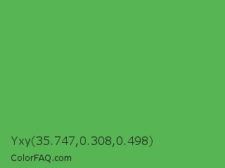 Yxy 35.747,0.308,0.498 Color is a normal green color and the nearest color is Apple #4fa83d. Hex code #58b553 and RGB value is rgb(88,181,83). In RGB color space, this color is composed of 35% red, 71% green, 33% blue, In CMYK color space, this color is composed of 51% cyan, 0% magenta, 54% yellow , 29% black , In HSL color space, this color has a hue angle of 117° , 40% saturation and 52% lightness.
