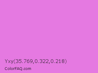 Yxy 35.769,0.322,0.218 Color is a light magenta color and the nearest color is Orchid #da70d6. Hex code #e579e1 and RGB value is rgb(229,121,225). In RGB color space, this color is composed of 90% red, 47% green, 88% blue, In CMYK color space, this color is composed of 0% cyan, 47% magenta, 2% yellow , 10% black , In HSL color space, this color has a hue angle of 302° , 68% saturation and 69% lightness.