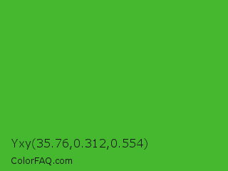 Yxy 35.76,0.312,0.554 Color is a normal green color and the nearest color is Wageningen Green #34b233. Hex code #45b830 and RGB value is rgb(69,184,48). In RGB color space, this color is composed of 27% red, 72% green, 19% blue, In CMYK color space, this color is composed of 63% cyan, 0% magenta, 74% yellow , 28% black , In HSL color space, this color has a hue angle of 111° , 59% saturation and 45% lightness.